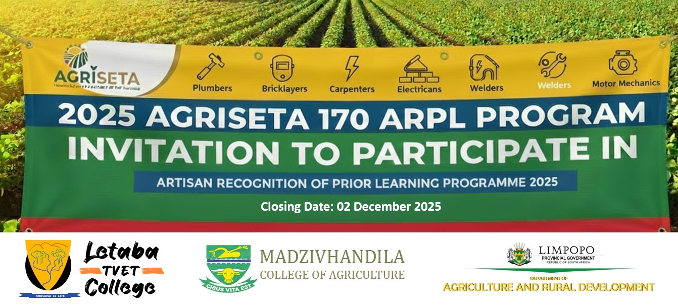 Madzivhandila College of Agriculture in partnership with Letaba TVET College invites candidates within Limpopo Province with substantial three (3) years relevant work experience to apply for the opportunity to obtain a formal, nationally recognised artisan qualification through 2025 ARPL programme for over three (3) months duration funded by AGRI SETA.